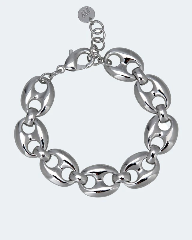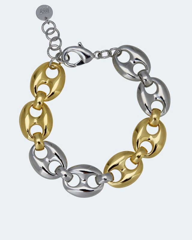 Das Armband ist aus Nichtedelmetall gearbeitet und in verschiedenen Legierungen erhältlich. Sie können es sich palladiniert, also in kühl-eleganter Platin-Optik bestellen oder aber gelbvergoldet mit sonnigem Goldschimmer. Wenn Sie lieber etwas ganz Besonderes möchten, wählen Sie die Bicolor-Variante. Alle drei Ausführungen sind auf Hochglanz poliert.