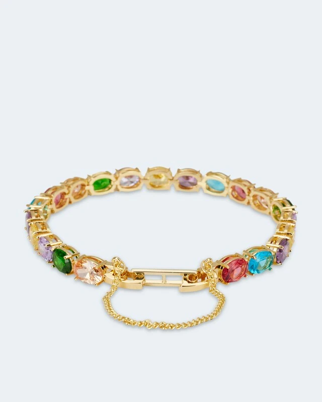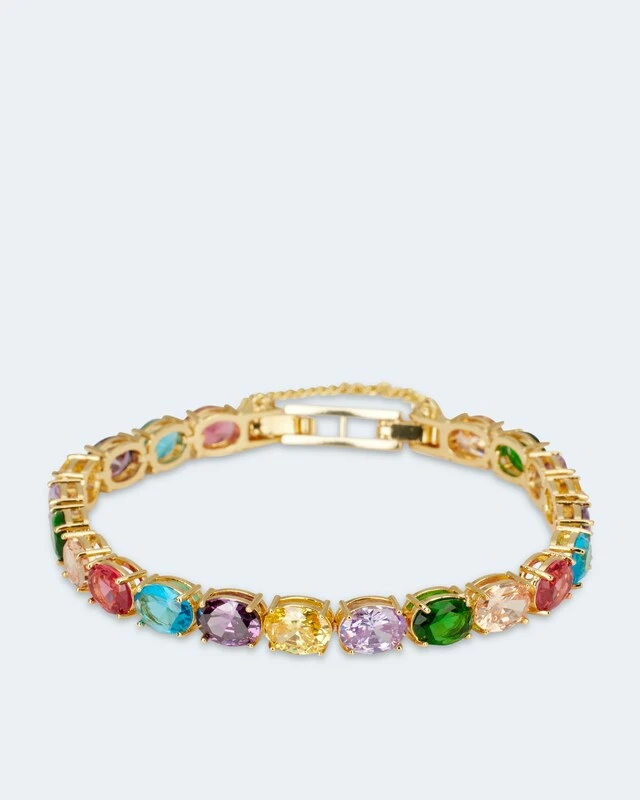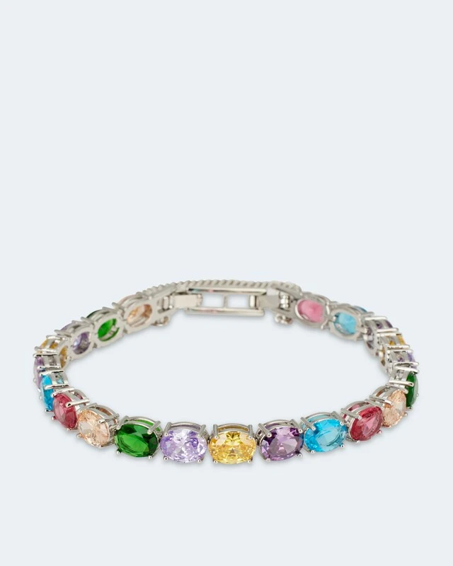 Bildhübsch, mit einem Hauch von Glamour: Das Armband von Alfredo Pauly wirkt sehr repräsentativ und gibt jedem Styling den letzten Schliff. Besetzt mit neun Glassteinen und zwölf Zirkonia in sieben verschiedenen Farben. Alle sind gleich groß, oval und für verführerische Funkel-Effekte facettiert. Wahlweise in Weiß- oder Gelbgold-Optik zu bestellen. Tipp: Passende Creolen finden Sie unter der Bestellnr. 460715.