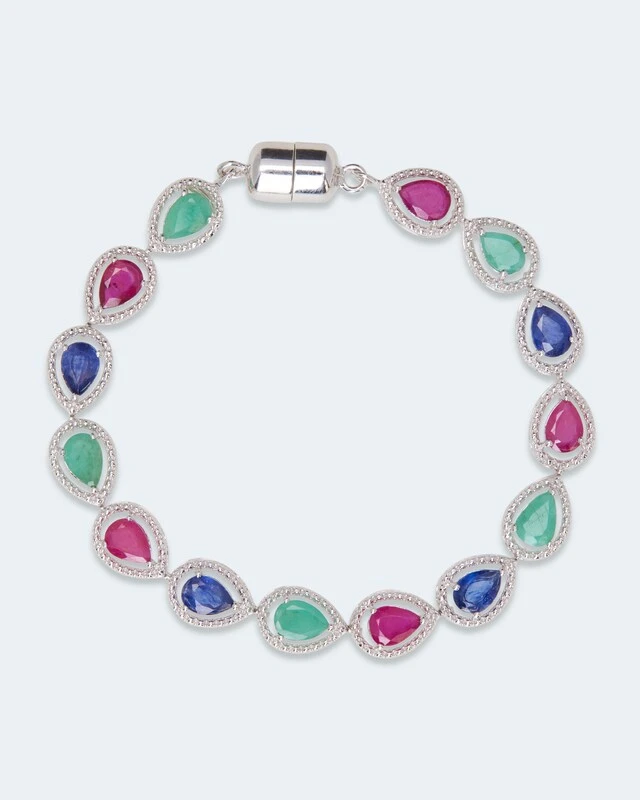 Ein Armband voller Pracht und Eleganz! Das Design besteht aus einem funkelnden Reigen aus Rubin, Saphir und Smaragd – die königlichen Edelsteine vereint in einer Pretiose von glamouröser Ausstrahlung!