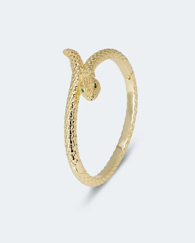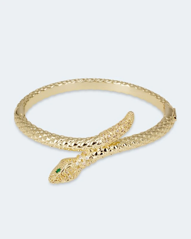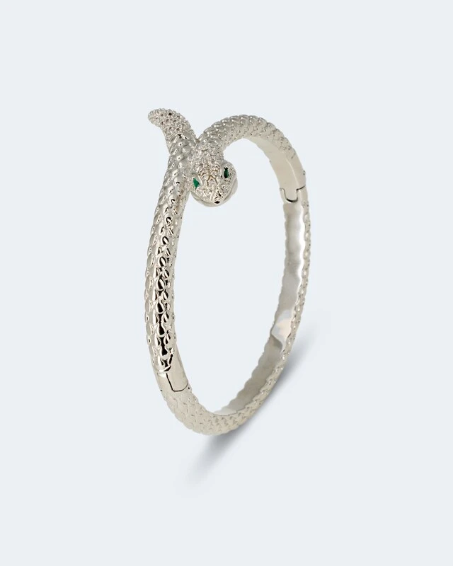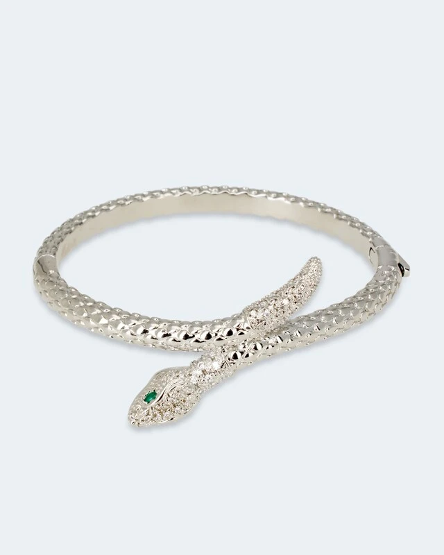 Mit einem Armreif betonen Sie Ihr Handgelenk und tragen ein Accessoire, das Ihren Look modisch abrundet. Zwei grüne Zirkonia dienen der Armschlange als Augen, während ihren Körper 72 weiße Zirkonia in verschiedenen Größen zieren. Aufwendige Strukturschnitte stehen für die typischen Schuppen der Schlangenhaut. Erhältlich in eleganter Weißgold-Optik oder mit sonnigem Gelbgoldschimmer.