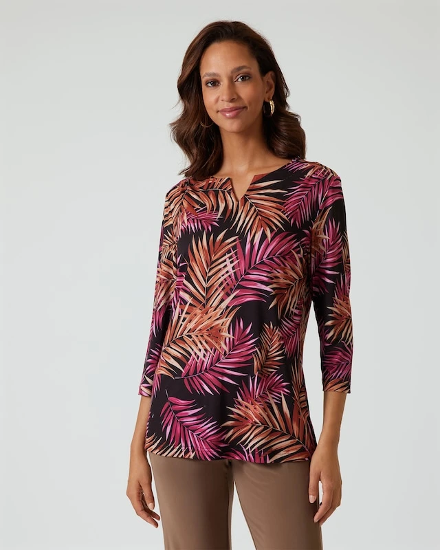Dieses schlanke Shirt erinnert an eine Bluse, ist aber bequem wie ein T-Shirt. Der modische Druck lässt sich elegant und sportlich kombinieren. Das weiche Stretchmaterial ist knitterarm und trageangenehm. Mit den Ärmeln in verkürzter Länge und dem schön gestalteten Ausschnitt passt das Shirt gut unter Blazer und Cardigans.