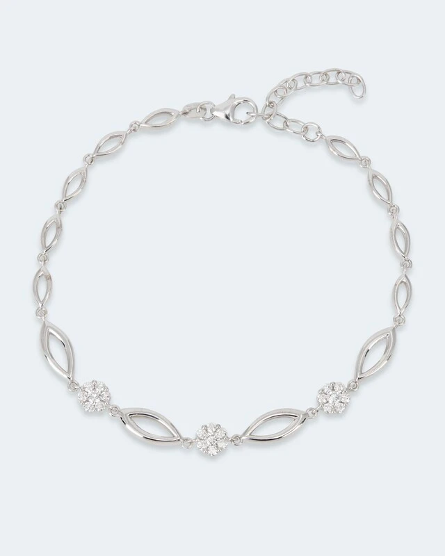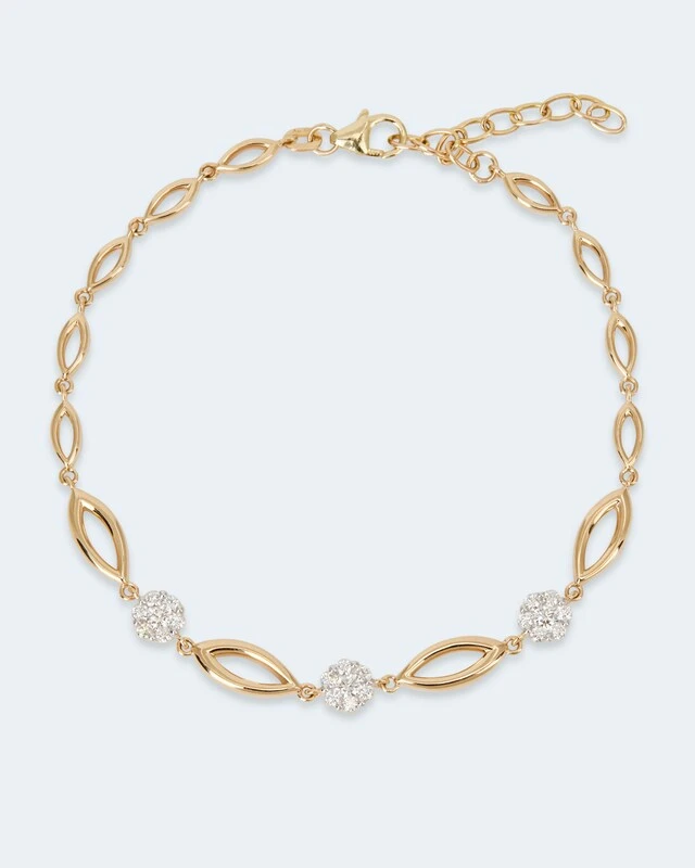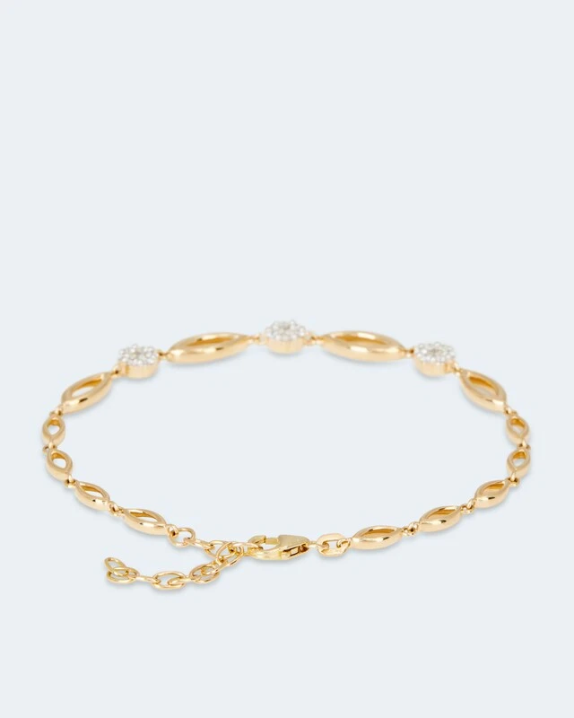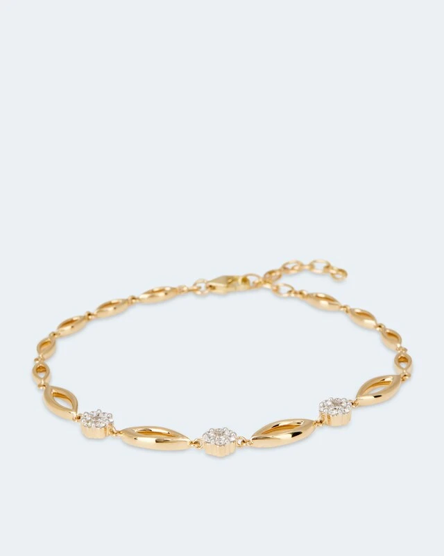 Bei diesem sensationellen Armband stimmt einfach alles: das romantische Design, das hochwertige 585er Gold und der karatstarke Brillantbesatz. Es ist mit insgesamt 21 weißen Brillanten von guter Schliffqualität besetzt. Angeordnet sind sie zu drei verführerischen Blüten: mit jeweils einem größeren Brillanten als „Stempel“ in der Mitte und sechs kleineren Steinen, die ihn umringen und als Blütenblätter fungieren. Die Armbandkette besteht aus vielen navetteförmigen Elementen in unterschiedlichen Größen, die im Verlauf aneinandergereiht sind.