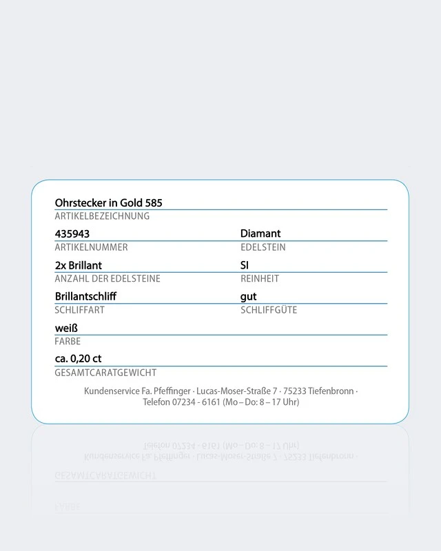 Jeder Ohrstecker ist mit einem weißen Brillanten in gutem Schliff besetzt. Ihre Reinheit SI besagt, dass erst unter 10-facher Vergrößerung kleine Einschlüsse sichtbar sind. Beide Brillanten schenken Ihnen ein Edelsteingewicht von rund 0,20 Karat.