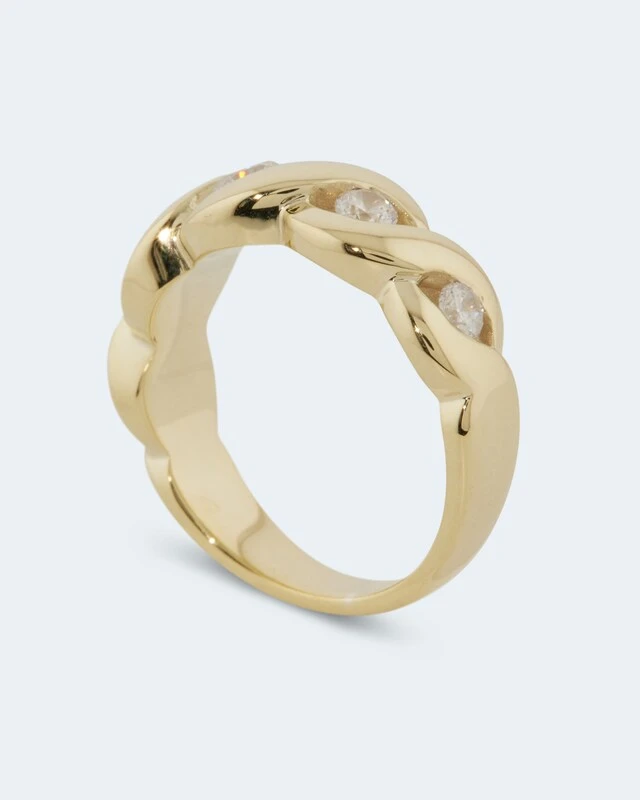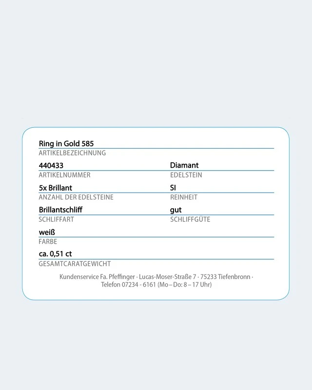 Glamour pur sichern Sie sich mit diesem atemberaubenden Ring aus der Pfeffinger Brillantschmuck Linie. Ein Quintett weißer Brillanten ziert den Ring aus glänzendem 585er Gelbgold. Der Ringkopf ist in Kettenoptik gestaltet, wobei die Brillanten von den Kettengliedern umschlungen sind. Die runden Steine sind im klassischen Brillantschliff veredelt und lassen in Sachen Funkeleifer keine Wünsche offen. Die Brillanten in guter Schliffqualität haben die Reinheit SI – Small Inclusions. Das heißt, die kleinen Einschlüsse sind nur unter 10-facher Vergrößerung erkennbar.
