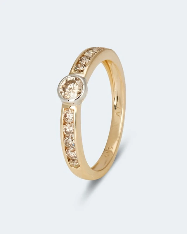 Die Schönheit dieses Rings aus hochglanzpoliertem 585er Gelb- undWeißgold raubt einem fast den Atem. Auf der Ringschiene sind elf Brillanten in einem edlen Champagnerton gefasst. Mittig sitzt ein größerer in einer Zargenfassung, rechts und links davon fünf kleinere in Kanalfassungen. Die Brillanten sind im Brillantschliff veredelt und haben die Reinheit P1. Mit diesem Ring am Finger werden Komplimente zu Ihrem ständigen Begleiter.