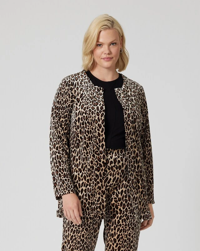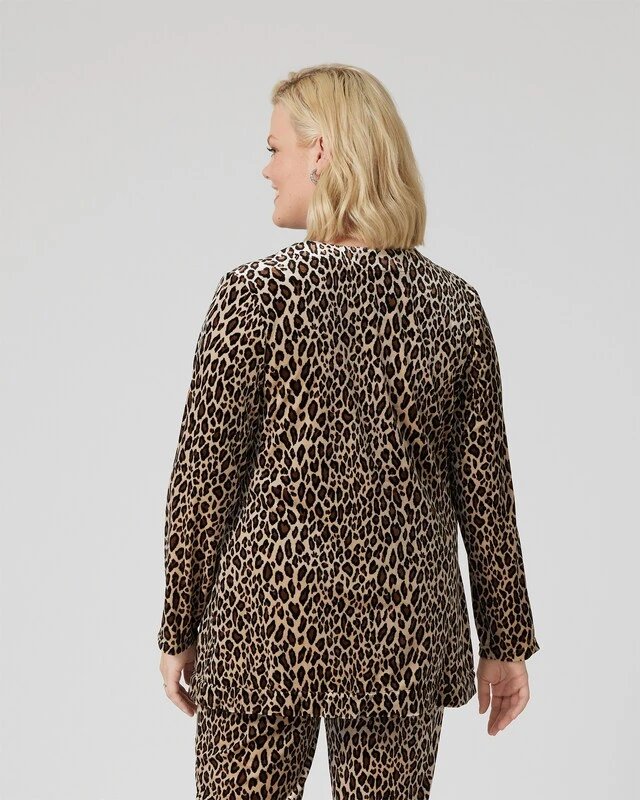Der Cardigan ist in offener Form designt und umscheichelt lässig Ihre Figur. So kaschiert er das eine oder andere Pölsterchen. Er begeistert mit einem Animaldruck, der auf dem glänzenden Samt besonders schön zur Geltung kommt. Tragen Sie einen Pullover darunter oder ein Shirt und wenn Ihnen zu warm wird, ist er ruckzuck ausgezogen und Sie können ihn lässig über der Schulter tragen. Der Cardigan macht sich toll zu feinen Stoffhosen, versprüht aber auch jede Menge Charme zu Jeans.