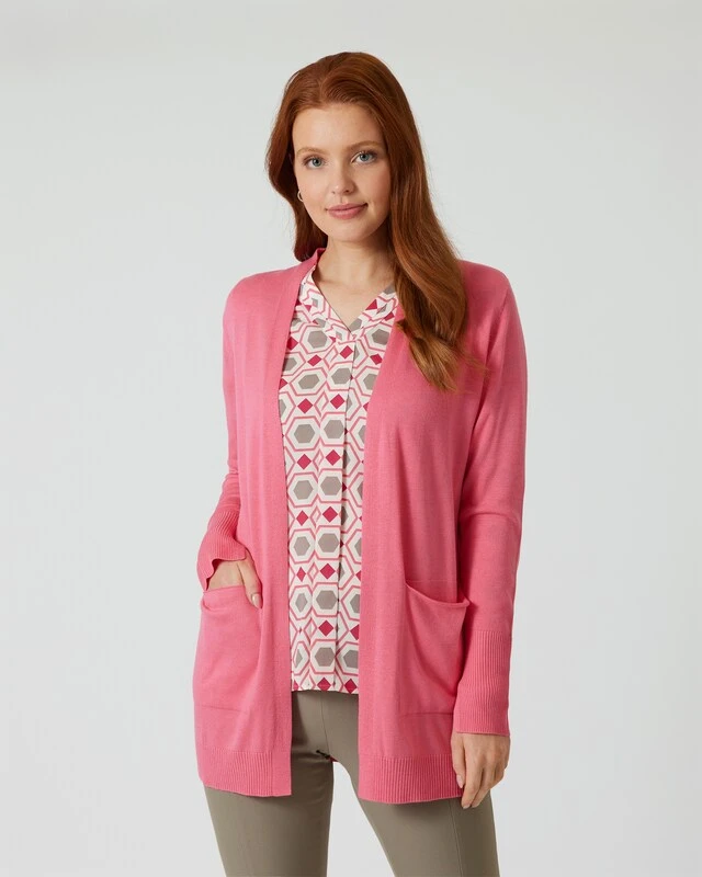 Lässige Eleganz aus Designer-Hand: Mit diesem aparten Cardigan aus der Kollektion THOM by Thomas Rath enthält Ihr Outfit den letzten Schliff. Durch die feine, matt schimmernde Strickqualität harmoniert der Look auch zu eleganten Outfits und macht sich toll über femininen Shirts, Tops und Blusen. Der Cardigan wird ganz entspannt offen getragen und hat zwei aufgesetzte Taschen.