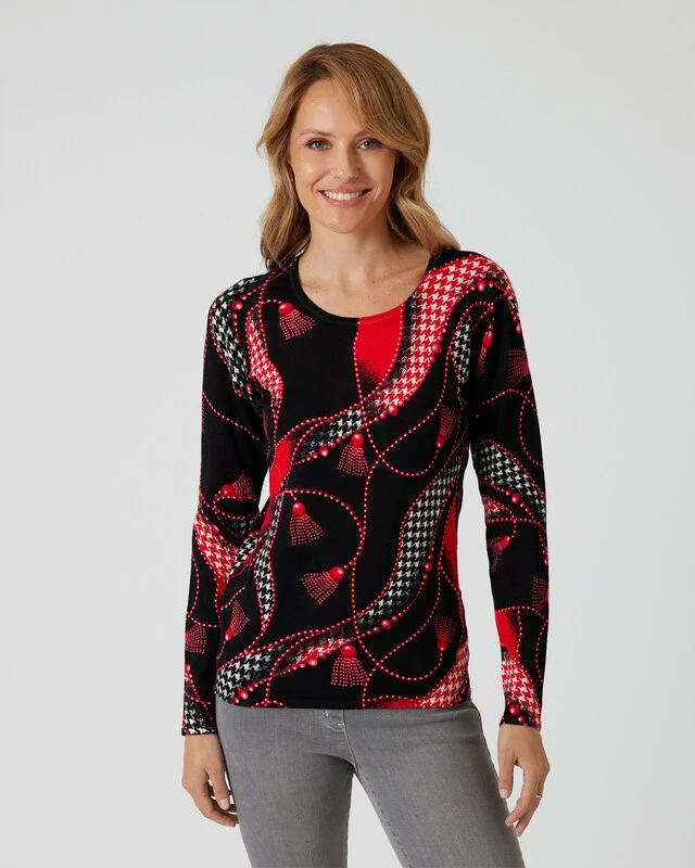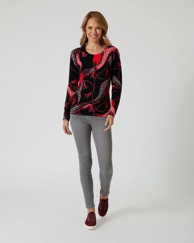 Selten war ein Pullover schicker: Dieser raffinierte Style von Ovanti inszeniert das klassische Hahnentritt-Design mit einem Kettenmuster in den Farben Rot und Schwarz. Ihr neuer Rundhals-Pullover ist aus einem hochwertigen Viskose-Mix gearbeitet, der fein und weich auf der Haut liegt und eine tolle Farbrillanz hat. Der leicht taillierte Schnitt formt eine schlanke Silhouette. Ein vielseitiger, kombistarker Look, der sowohl in der Freizeit als auch im Office stilsicher überzeugt.