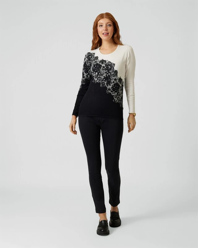 Einen besonders raffinierten Strickbegleiter sichern Sie sich mit diesem wunderschönen Classic Pullover von Ovanti: Über die Vorder- und Rückseite zieht sich ein zarter Spitzenbordüren-Print. Dabei unterstreicht die diagonale Platzierung nicht nur den modernen Appeal, sondern auch die feminine Silhouette.