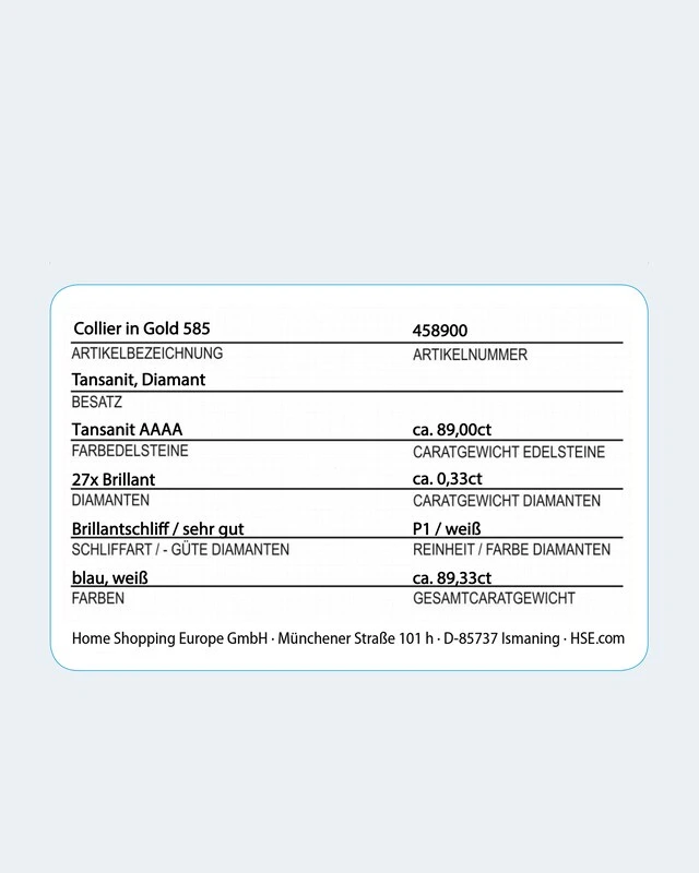 Tauchen Sie ein in eine Welt voller Stil und Luxus: Mit diesem Collier von Precious Tales verwandeln Sie Ihr Outfit und Ihre Ausstrahlung im Nu. Das Schmuckstück präsentiert rund facettierte Tansanite in herrlicher AAAA-Farbqualität, welche hier dicht an dicht zu einem echten Pracht-Look aufgefädelt sind. Als raffinierte Ergänzung sind in Abständen feine Rondelle aus edlem 585er Gelbgold eingearbeitet, welche durch insgesamt 27 weiße P1-Brillanten das Strahlen des Colliers zusätzlich betont. Ein Karabiner sorgt für den sicheren Halt.