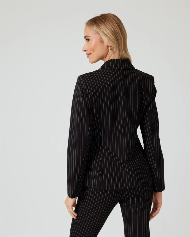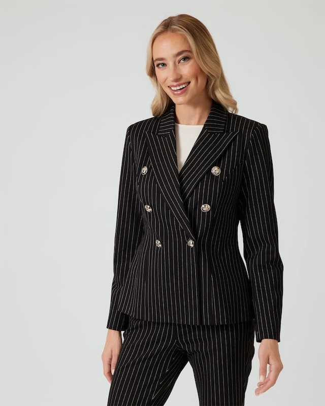 Der hinreißende Nadelstreifen-Blazer vereint feminine Eleganz mit glamourösen Elementen. Den Glamour-Touch erhält er durch sein zweireihiges Design mit den großen, goldfarbenen Knöpfen. Besten Tragekomfort garantieren die Abnäher, der figurnahe Schnitt und das weiche Innenfutter. Die Grundfarbe Schwarz erlaubt zahlreiche, stilvolle Kombinationen. Tipp: Eine passende Hose finden Sie unter der Bestellnr. 459244.