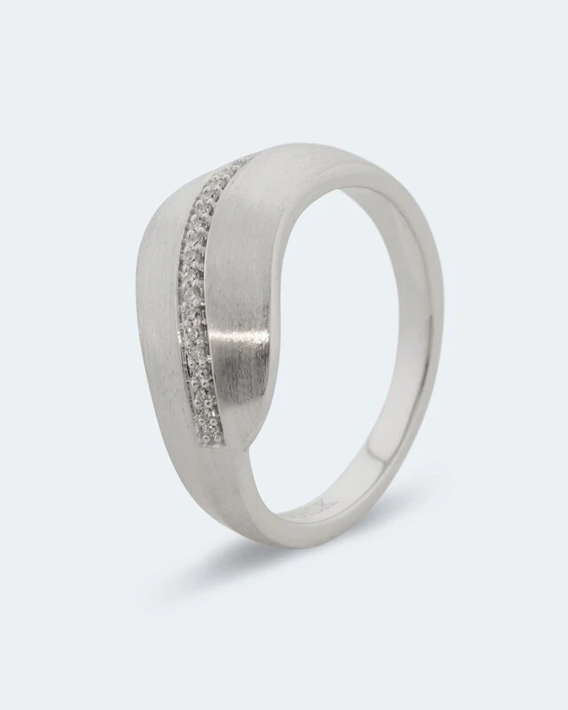 Ein silbernes Band mit dynamischem Schwung umschließt Ihren Finger, wenn Sie diesen Ring tragen. Von dem stilvoll modern gestalteten Schmuckstück blitzen Ihnen insgesamt 17 weiße Diamanten entgegen. Ein herrliches Schauspiel, das so manchen Blick auf sich zieht!