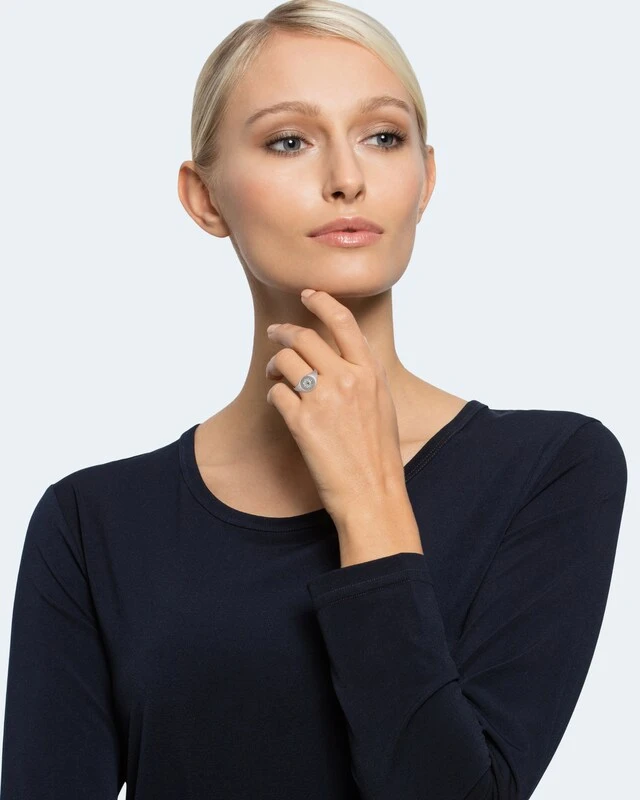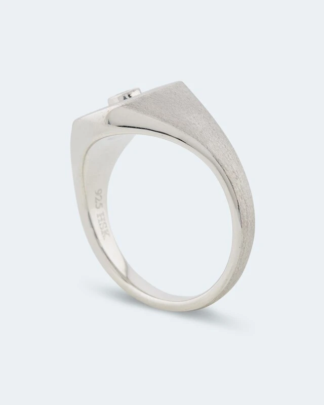 Der Ring ist aus 925er Sterlingsilber gefertigt. Die Oberfläche ist rhodiniert, wodurch das Schmuckstück einen herrlichen Weißgoldglanz erhält und gleichzeitig optimal vor Abrieb und Anlaufen geschützt ist. Am Ringkopf ist die Ringschiene betont breit gehalten und wird dann nach unten hin schmaler.