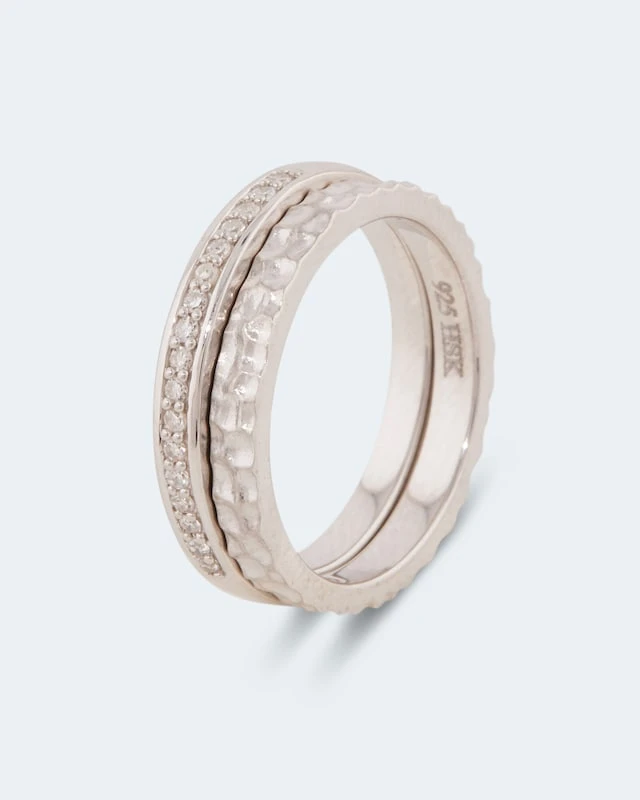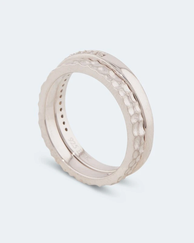 Ein Glanzstück, das Ihr Styling im Handumdrehen aufwertet: Dieses bildschöne Ring-Set besteht aus 2 Einzelringen, die Sie einzeln oder zusammen tragen können. So erhalten Sie jedes Mal einen ganz neuen Look. Ein Ring ist besetzt mit 17 weißen Diamanten und bietet einen funkelnden Blickfang. Ein Ring besitzt ein kunstvolles Hammerschlagmuster.