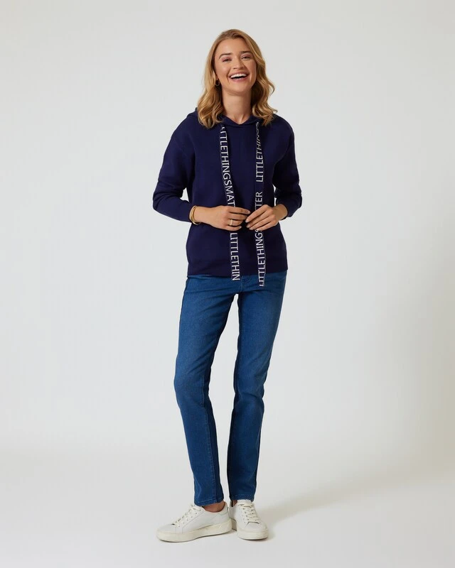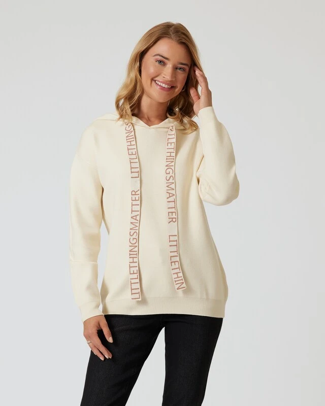 Dieser süße Hoodie passt perfekt zu einem modisch sportiven Style. Besonderer Eye-Catcher ist der Kapuzenbändel, der mit einem dekorativen Lettering verziert ist: „Little things matter“. Der vielseitige Pullover ist aus weichem Strick mit überschnittenen Schultern gefertigt und in verschiedenen Basic-Farben erhältlich. Bequem in der Maschine waschbar.