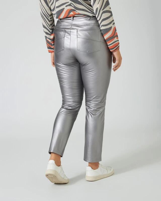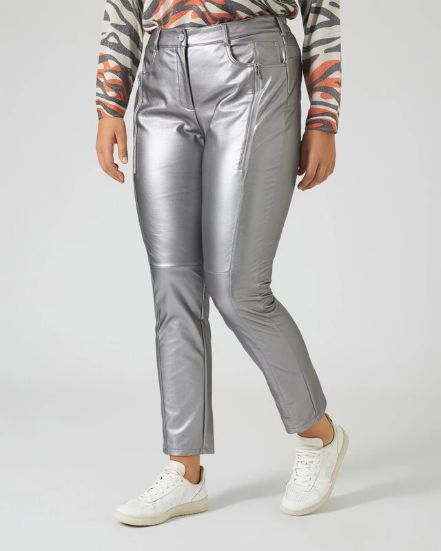 Wow, diese Hose ist ein extravagantes Fashion-Highlight zum Zungeschnalzen. Aus veganem Leder (Viskose) gefertigt, erstrahlt sie in einer glamourös glänzenden Metallic-Silberoptik. Raffinierte Extra-Hingucker sind die Kontrast-Deko-Reißverschlüsse seitlich am Oberschenkel. Das enganliegende Bein hat einen optisch streckenden Effekt – tragen Sie am besten hohe Schuhe dazu. Insgesamt ein edles Mode-Piece zum Schönfühlen.