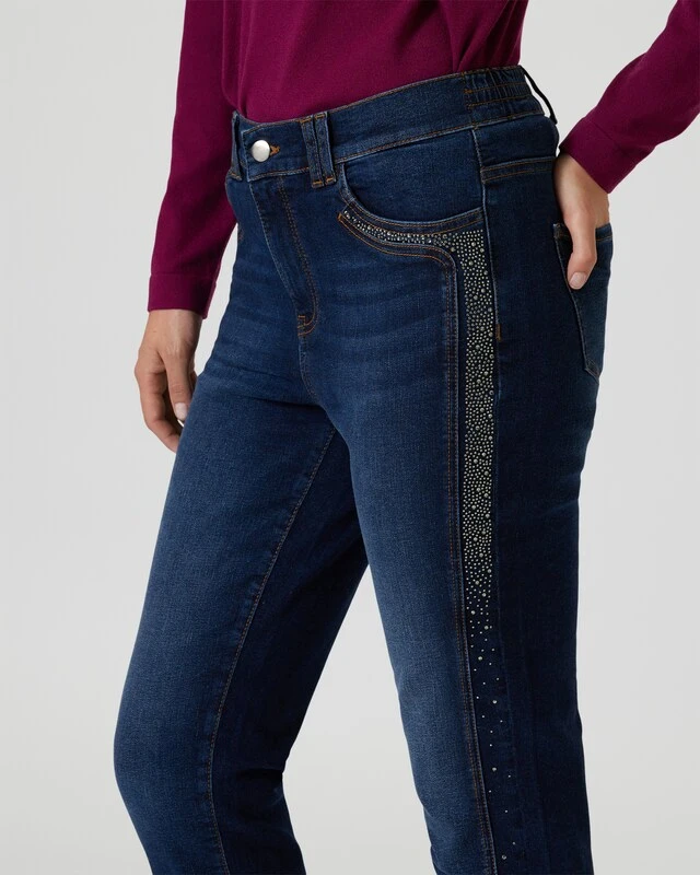 Die 5-Pocket-Hose ist entlang der Vordertaschen und der Seitennaht mit einer funkelnden Strass-Deko in Streifenform verziert. Nach unten hin werden es immer weniger Glitzersteinchen, so dass eine „Strassregen-Optik“ entsteht.