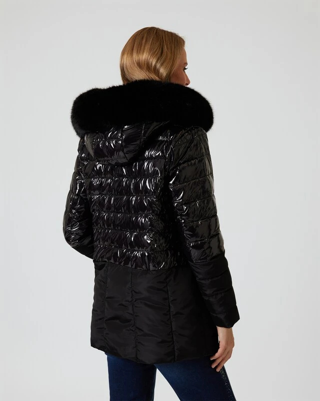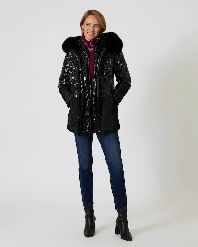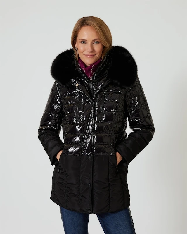 Mit dieser coolen Jacke von Maloo kann der Herbst kommen. Der schicke Style zeigt einen modischen Mix aus glänzender und mattierter Oberfläche, nicht zuletzt mit optisch taillierendem Effekt. Als toller Blickfang wirkt zudem das großzügige Kunstfell am Kapuzenrand. Die Jacke verfügt über mehrere Taschen sowie einen Frontreißverschluss mit Knopfleiste. Dezent wärmend wattiert.