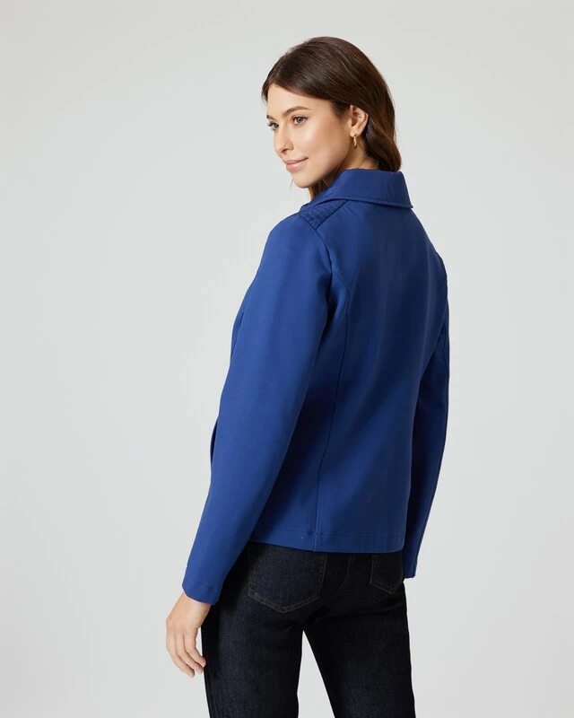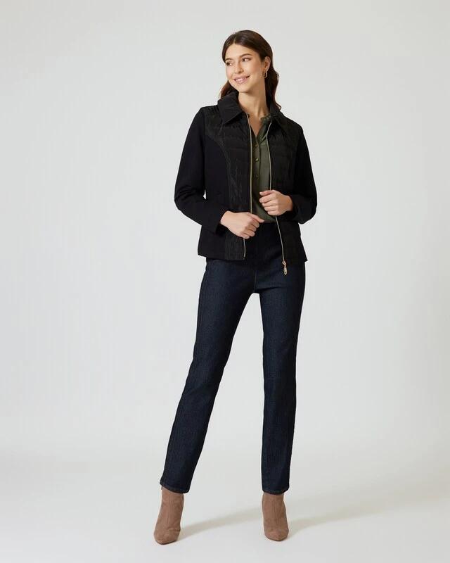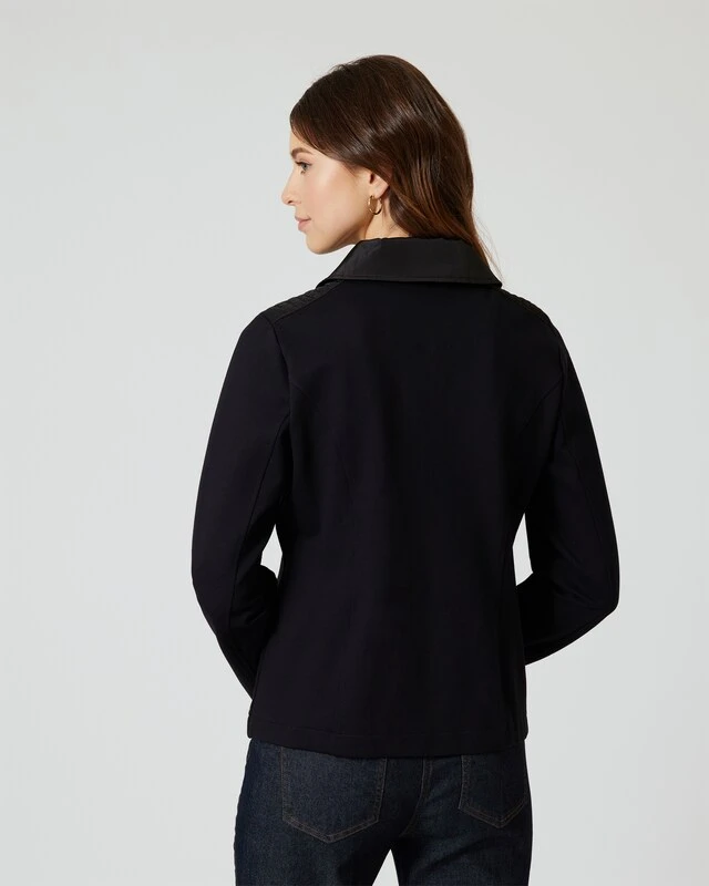Die Jacke ist auf der Vorderseite mit einem vertikalen Steppeinsatz gearbeitet. Ergänzt durch vertikal angesetzte, seitliche Eingriffstaschen mit breiter Blende.