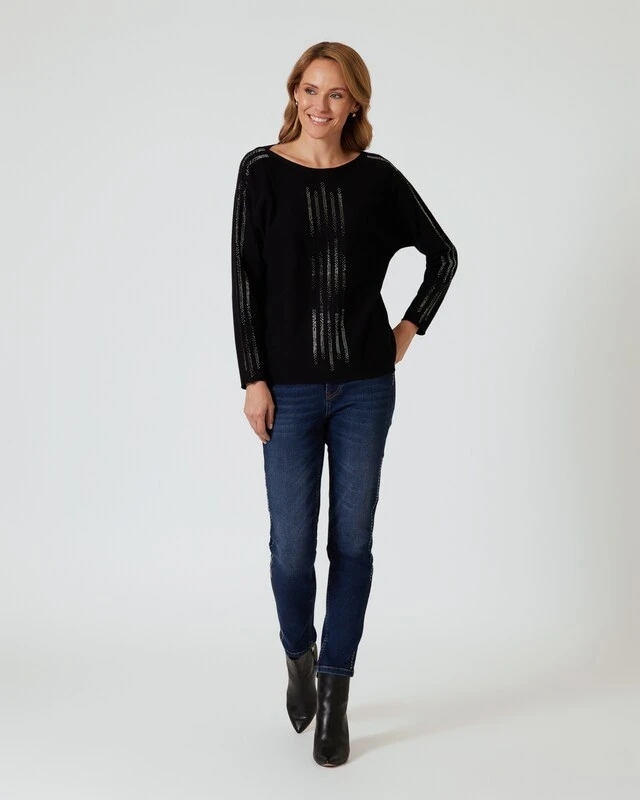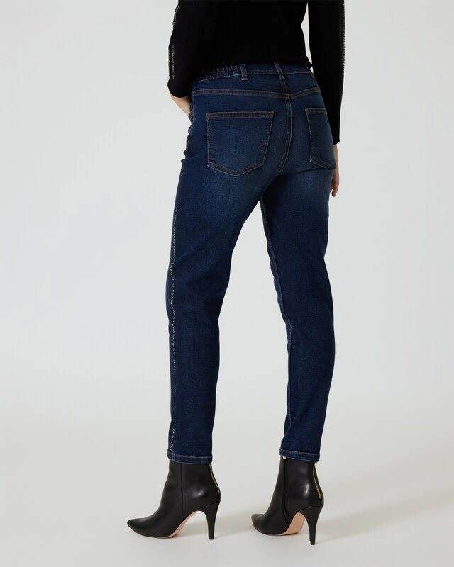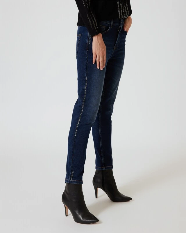 Von Jeans kann man bekanntlich nie genug haben. Diese hier aus der Kollektion von Maloo kommt im figurfreundlichen 5-Pocket-Style mit geradem, knöchellangem Bein. Ein Hingucker ist die Strassleiste seitlich am Bein. Ganz nebenbei sorgt das glitzernde Band für lange Beine. Die dunkelblaue Jeans ist mit 20 % recycelter Baumwolle gearbeitet. Kombinieren Sie hohe Schuhe dazu und Sie tragen einen Look, der sich immer sehen lassen kann.