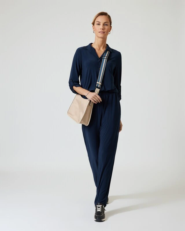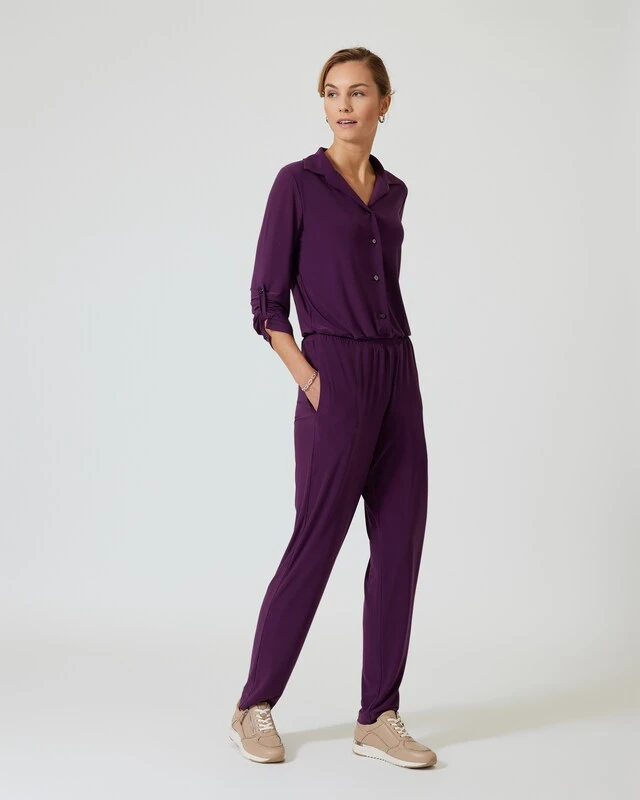 Der Jumpsuit kommt mit einem feinen Blusenkragen und einer darunter anschließenden Knopfleiste zu Ihnen. Dadurch ist auch der Einstieg besonders leicht. Die Taille ist mit einem Gummizug gearbeitet, sodass Ihre Figur äußerst schmeichelhaft umspielt wird.
