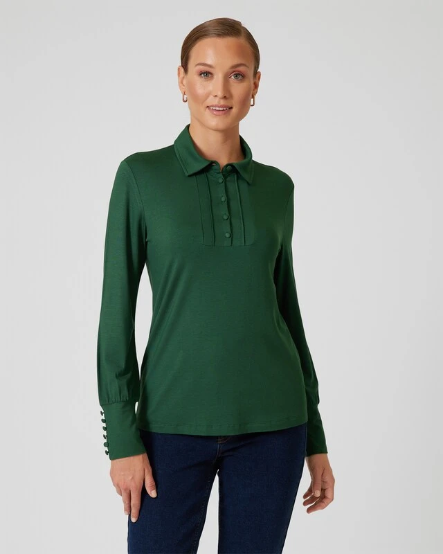 - Ärmelsaum und Polokragen mit tonalen Knöpfen