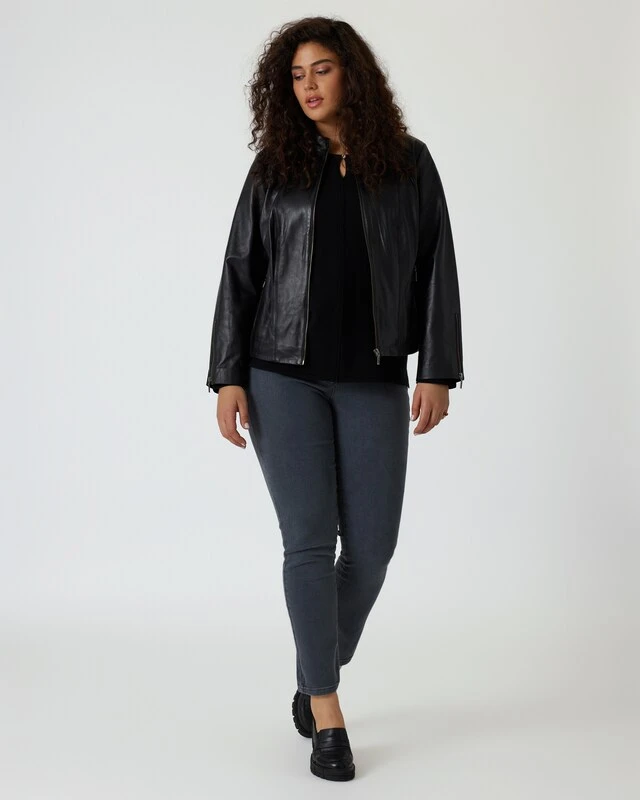 Die Jacke ist aus feinem Lammnappaleder gefertigt und dank Unterfütterung sehr angenehm im Tragegefühl. Ein markanter Stehkragen und ein durchgehender Reißverschluss sorgen für eine trendstarke Optik – ob offen oder geschlossen getragen.