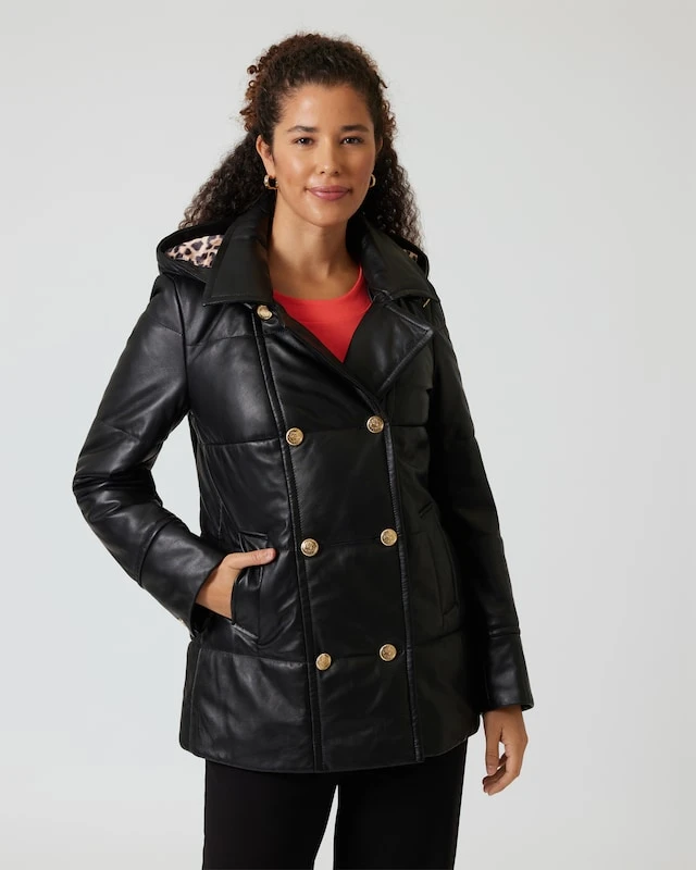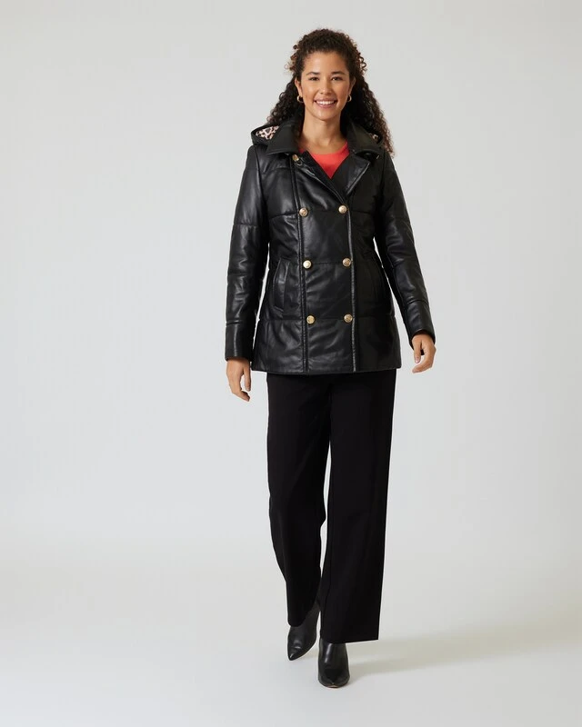 Tauchen Sie ein in die Welt des Luxus: Dieser Ledermantel vereint zeitlose Eleganz und raffinierte Details und wird Sie mit seinem unvergleichlichen Tragekomfort begeistern. Die Schmuckknöpfe geben dem Look einen Hauch von Glamour. Die abnehmbare Kapuze mit Leo-Druck Futter verleiht dem Mantel einen aufregenden Touch und sorgt für zusätzliche Vielseitigkeit. Der stylische 2-Reiher-Look des Mantels ist ein echter Blickfang und unterstreicht Ihren anspruchsvollen Stil. Die Ziernähte im Rauten-Design sorgen für einen edlen Charme und betonen die hochwertige Verarbeitung. Die seitlichen Eingriffstaschen bieten nicht nur praktischen Stauraum, sondern setzen auch modische Akzente. Bestellen Sie noch heute Ihren edlen Mantel und erleben Sie den Unterschied, den hochwertige Materialien und durchdachtes Design machen.