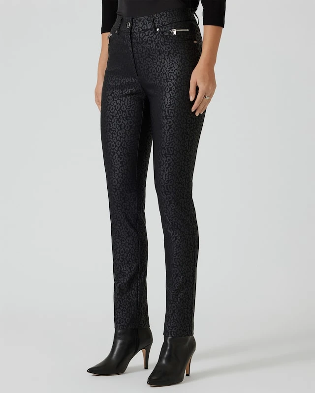 Wenn Sie auf der Suche nach einer Hose sind bei der einfach alles passt, dann sind Sie jetzt fündig geworden. Die Magic Hose mit Leodruck von Judith Williams sitzt dank 5-Pocket-Style, Knopf und Reißverschluss einfach perfekt. Tragen Sie einen Gürtel in den Schlaufen und Ihre Hose wird zum Gesamtkunstwerk.