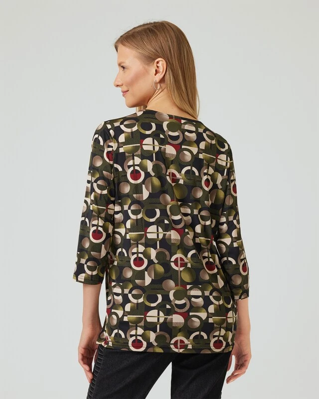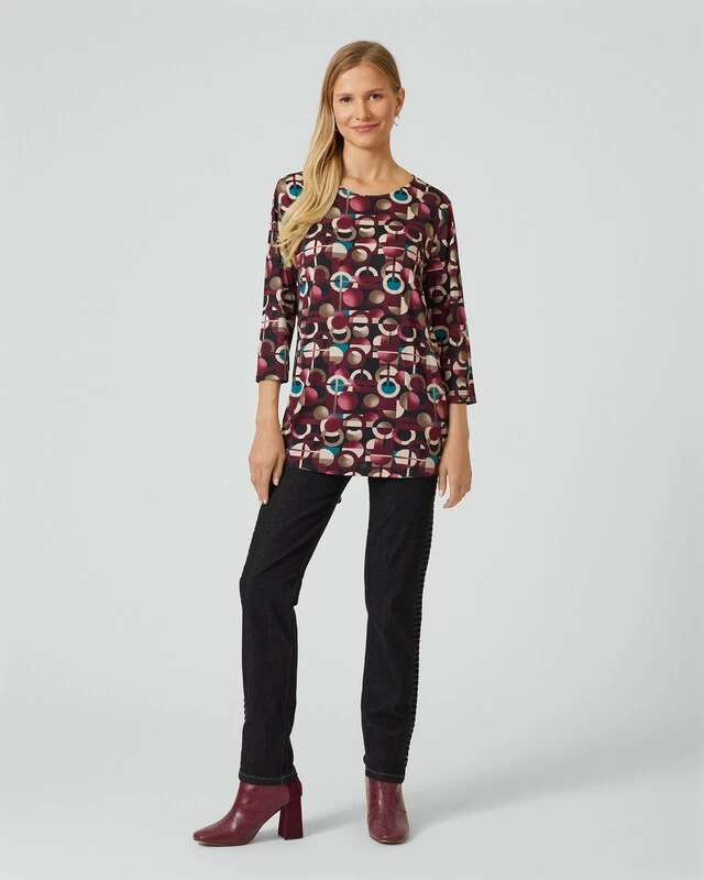 Der erfrischende Charme dieses Helena Vera Styles entsteht durch den retro-artigen Print. Dadurch wirkt das vielseitige Midi-Shirt besonders trendaffin, aber auch betont feminin: Die feine Stretch-Qualität ist tailliert geschnitten und bringt die Silhouette sehr schön zur Geltung. Ein toller Hingucker für viele Outfits, in drei Farbvarianten zur Wahl.
