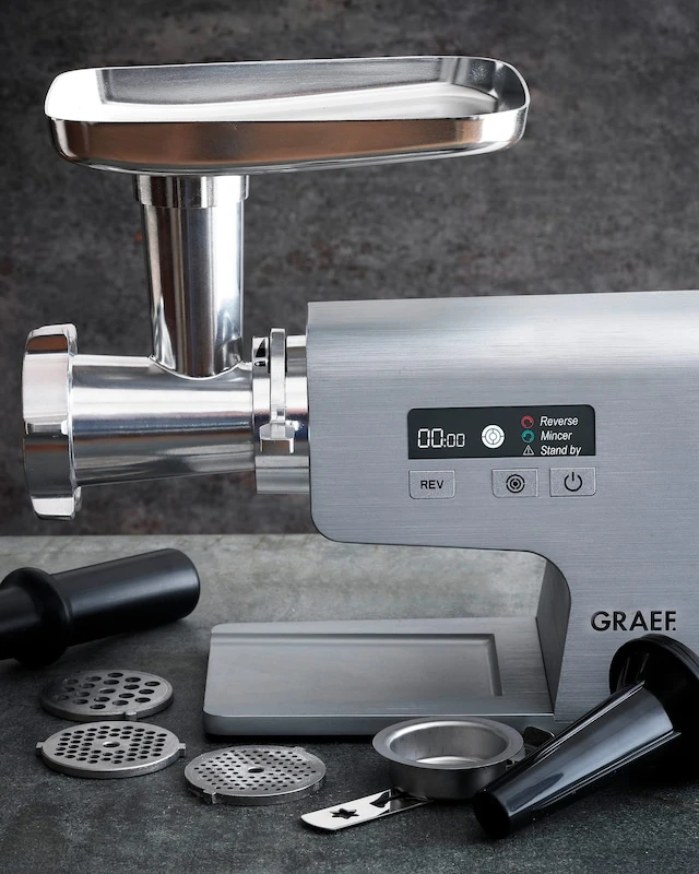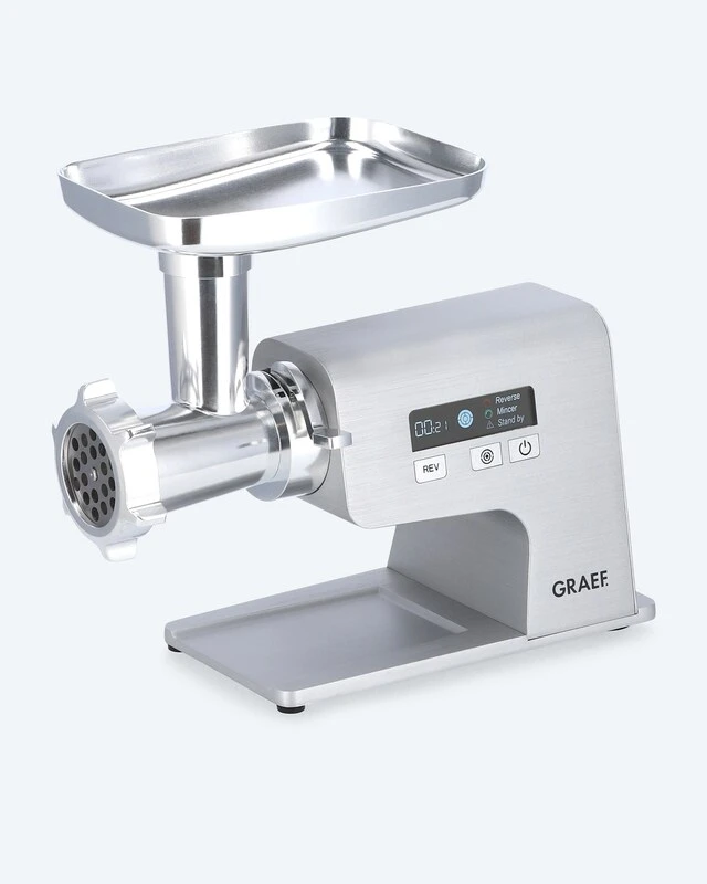 Die Digitalanzeige macht die Handhabung einfach. Dazu bietet das Gerät einen 2-teiligen Schneidvorsatz mit Messer und Lochscheibe. Bei der Verarbeitung der Lebensmittel gibt es erfreulich geringe Rückstände durch ein optimales Förderungssystem.