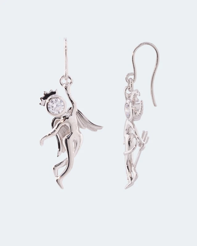 Die Ohrjänger sind aus 925er Sterlingsilber gefertigt. Die Oberfläche ist rhodiniert und kunstvoll geformt. Sie besticht das Engelchen durch die zarte Frauenfigur mit Krone und Engelsflügeln. Das Teufelchen ist stilecht mit Hörnern und Dreizack ausgestattet.