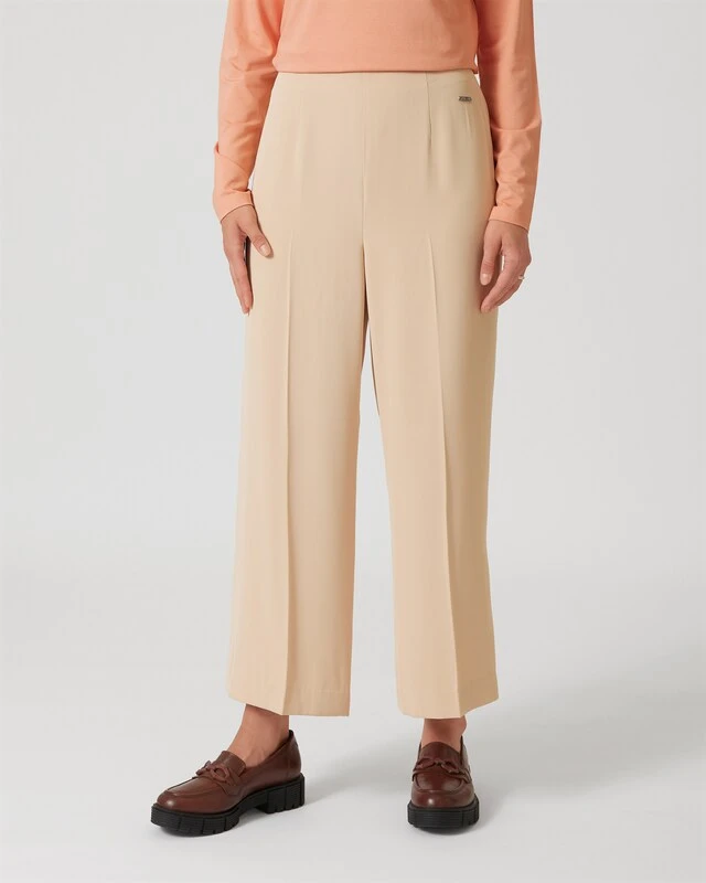 Palazzohosen sind angesagt und haben mit ihrem weiten, geraden Beinschnitt einen super Schlank-Effekt. Die Bügelfalten haben einen zusätzlichen, streckenden Effekt, sodass Sie größer und schlanker wirken. Das luftige Material hat eine fließende Qualität, die Ihre Beine umschmeichelt und der elastische Bund auf Nabelhöhe schmiegt sich gefällig an Ihre Figur. Die längliche TR-Logo-Plakette links unterhalb vom Bund zeigt, dass Sie Designermode tragen. Sie können die Hose mit flachen oder hohen Schuhen kombinieren, mit einer edlen Bluse oder mit einem lässigen Shirt – alles ist erlaubt.