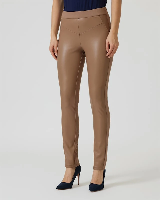 Die Hose ist aus einem Materialmix gearbeitet und ein echter Hingucker. Die Röhre ist vorne mit einem weichen Leder-Imitat beschichtet, hinten ist sie aus einem soften Viskose-Mix in Ponte-Qualität. Ihr neuer Fashion-Liebling ist obendrein auch noch unheimlich bequem. Der breite Dehnbund auf Nabelhöhe schmiegt sich perfekt an Ihre Figur und sorgt für einen flachen Bauch.