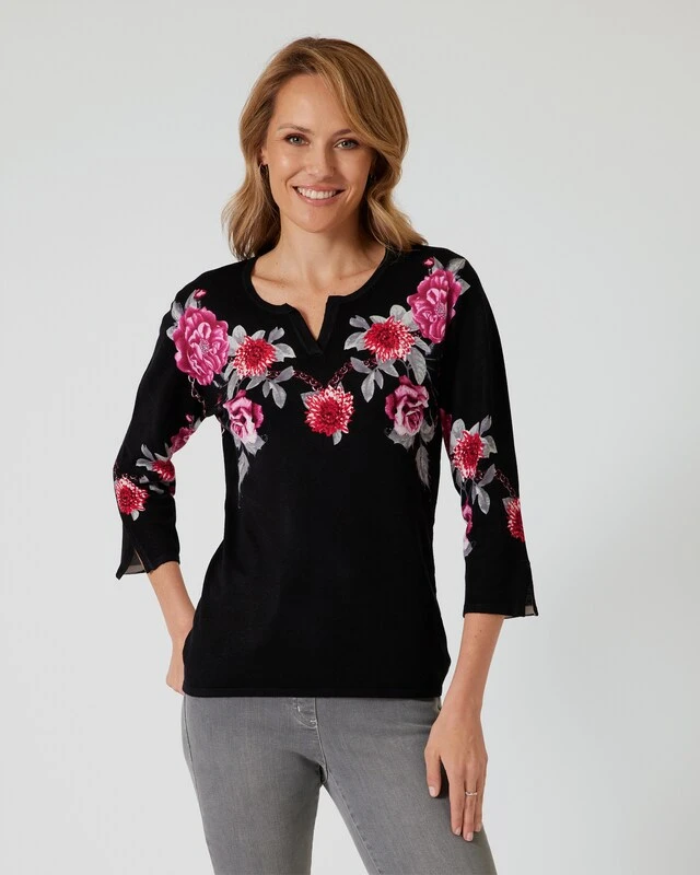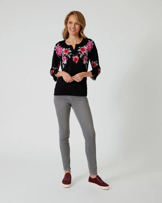 Abgesehen von den bunten Blüten ist der Pullover unischwarz gehalten. Dadurch hat er eine optisch figurschmeichelnde Wirkung, außerdem ist er so für viele schicke Kombis zu haben.