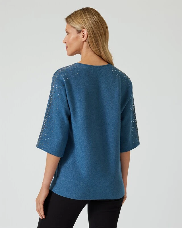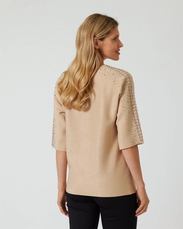 Mit diesem Pullover haben Sie Mode im Schrank, die Sie zu allem kombinieren können. Der Pullover ist unifarben und an den Schultern und an den Ärmeln mit funkelndem Strass verziert. Ein klassischer Rundhalsausschnitt und ganzjährig tragbare 3/4-Ärmel machen das Design komplett. Der Fashion Hit ist aus einem soften Viskose-Mix mit 15 % metallischen Fasern gearbeitet. Die Metall-Fasern geben dem Material einen edlen Glanz, wodurch der Pullover einen edlen Touch bekommt.