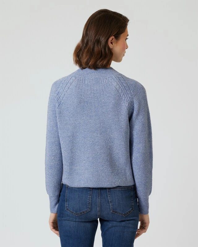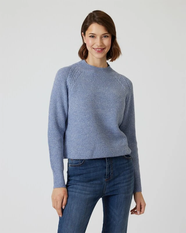 Der Pullover ist im hübschen Längs-Rippstrick gefertigt und mit Glanzgarn durchsetzt, sodass er dezent schimmert. Das Zusammenspiel aus kleinem Stehkragen und Raglanärmeln zaubert eine schöne Schulterpartie und lässt Sie jederzeit gepflegt auftreten. Ein breiter, enganliegender, gerippter Ärmelsaum rundet das Design ab.