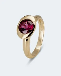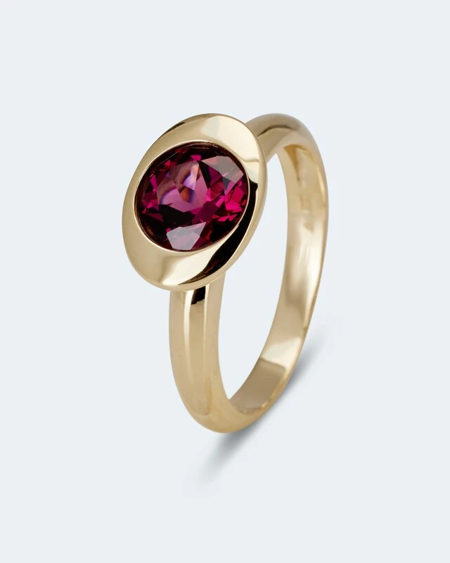 Das Schmuckstück ist aus 375er Gelbgold gearbeitet, das sorgfältig auf Hochglanz poliert ist. Der warme Schimmer des Goldes harmoniert perfekt mit dem wundervollen Rotton des Edelsteins.