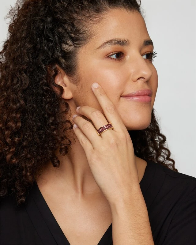 Die quadratischen bzw. eckigen Edelsteine sind nur von 2 dekorativen Reihen kleiner Krappen getrennt. So ergibt sich die eindrucksvolle, flächige Wirkung, die diesen Ring so unverwechselbar macht.