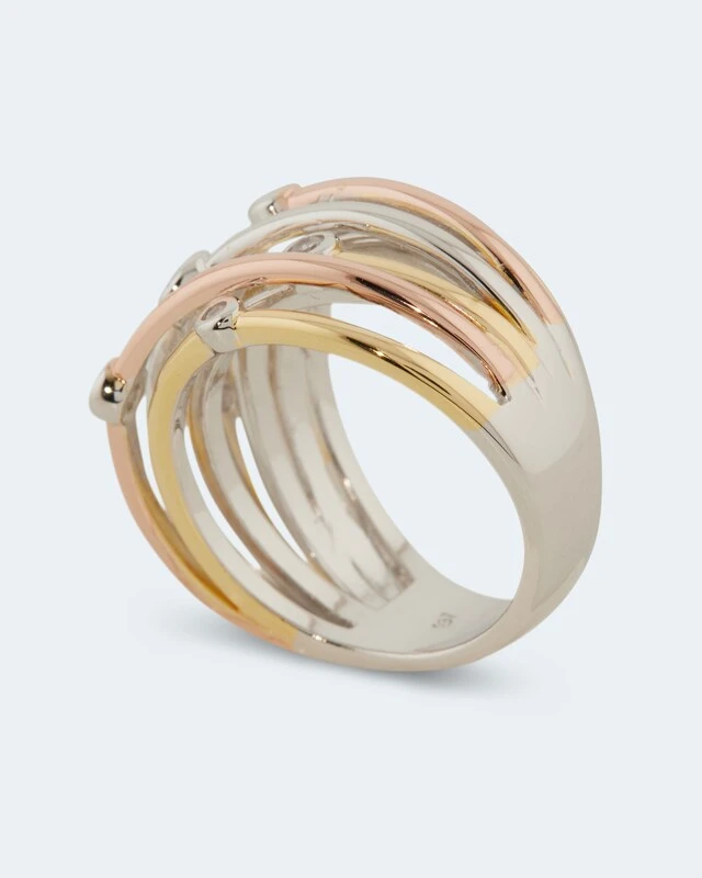Abgerundet wird das moderne Design durch die raffinierte Tricolor-Optik. Dafür sind einige der Stränge gelb- oder rosévergoldet, die übrigen Oberflächen sind silberweiß rhodiniert.
