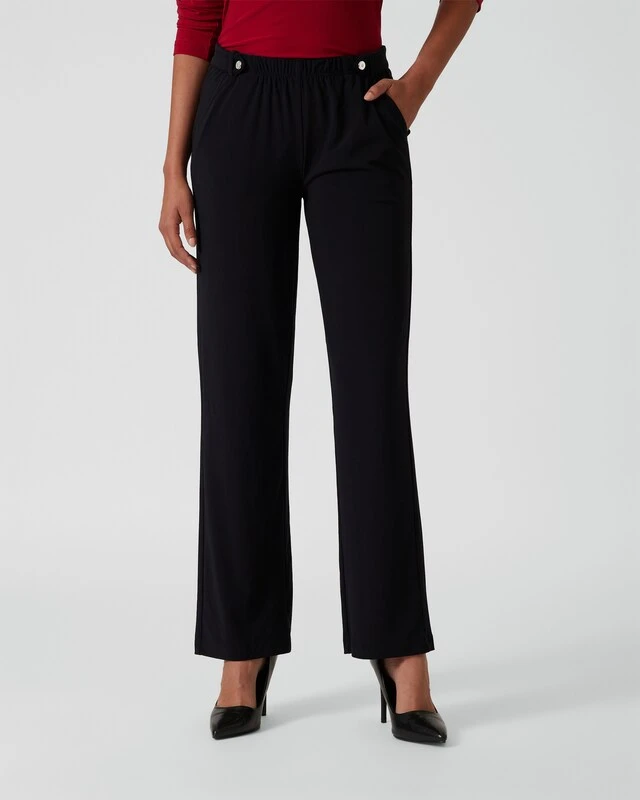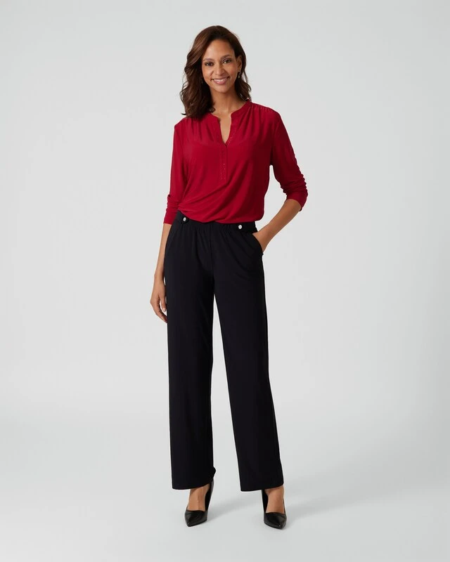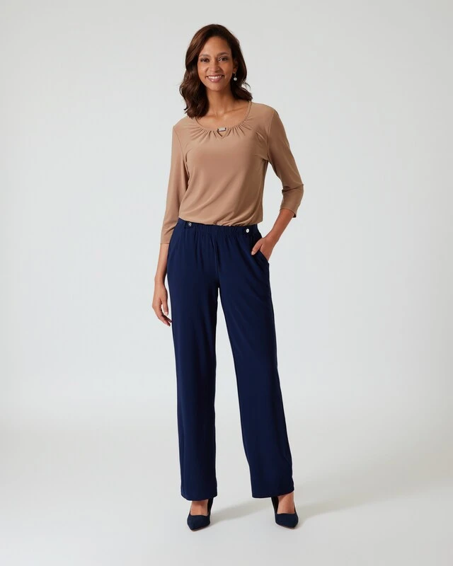 Ob lässig oder elegant, die weite Hose setzt Sie immer schick in Szene. Der elastische Schlupfbund ist mit einem Riegel mit Knopf ausgestattet und sitzt herrlich bequem. Je nachdem, mit welchem Oberteil und welchen Schuhen Sie sie kombinieren, kommen Sie mal sportlich-lässig, mal umwerfend ladylike daher. Das gerade, weite Bein streckt optisch, sodass Sie mit einer schlanken Silhouette punkten.