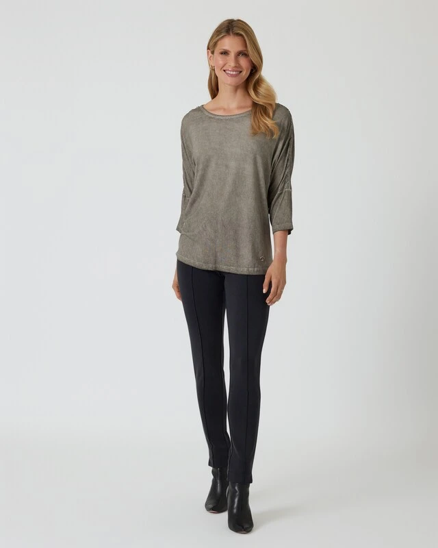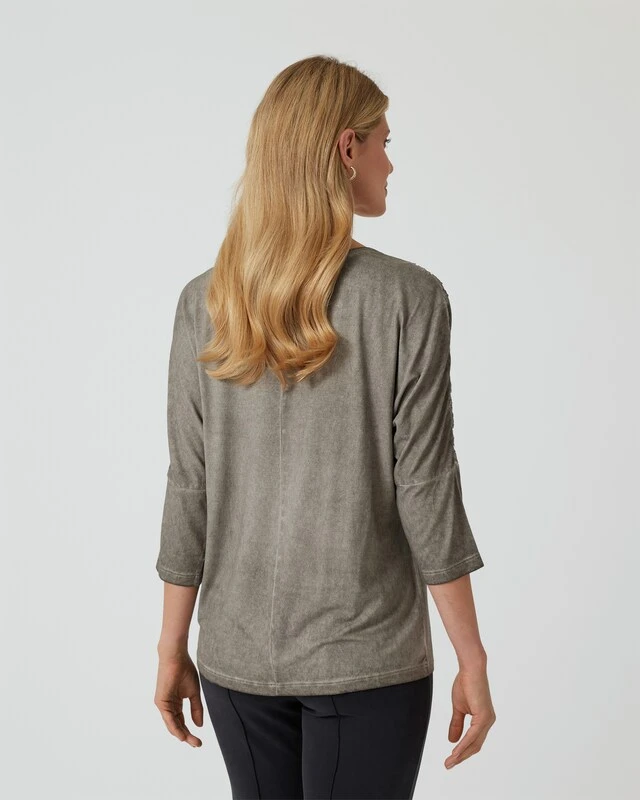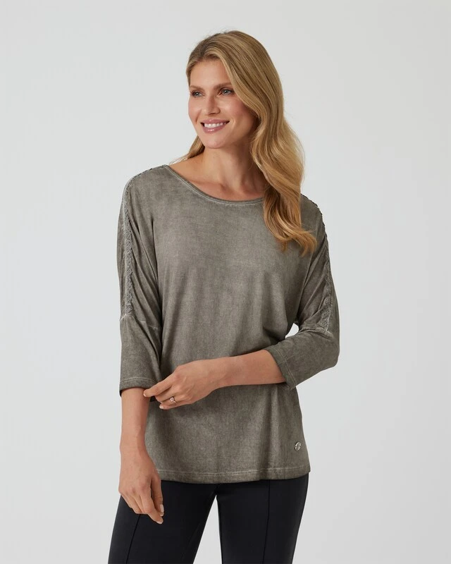 Dieses Shirt ist der Inbegriff von lässigem Style. Die verwaschene Optik verleiht ihm einen coolen Vintage-Look. Die Fledermausärmel in luftiger 3/4-Länge sorgen für einen lockeren und entspannten Tragekomfort, während das Spitzendekor auf der Oberseite mit einem Hauch von Romantik und Weiblichkeit aufpeppt. Der klassische Rundhalsausschnitt bietet eine zeitlose Silhouette und ermöglicht vielseitige Kombinationsmöglichkeiten. Egal, ob Sie es lässig zur Jeans oder eleganter zur schicken Hose tragen – dieses Shirt setzt immer modische Akzente.