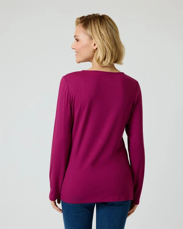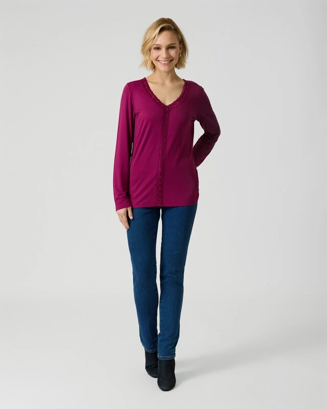 Wenn Sie bei Ihrer Garderobe einen romantischen Mehrwert zu schätzen wissen, dann passt dieses Shirt genau in Ihr Beuteschema. Die zarte Spitze am Ausschnitt und in einem Streifen mittig vorne bis zum Saum ist zusätzlich mit funkelnden Strass-Steinchen verziert – ein zauberhafter Hingucker. Für jederzeit besten Tragekomfort bürgt das elastische Viskose-Gewebe. Ideal für schnelle Kombis ist das Unidesign in der Trendfarbe Beere.