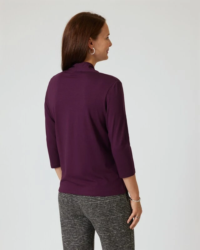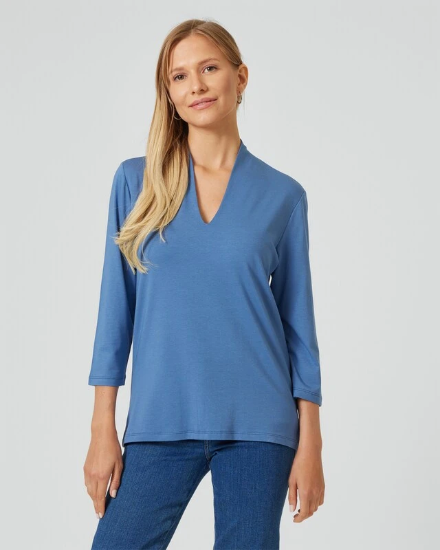 Entdecken Sie das perfekte Basic für Ihren Kleiderschrank: Dieses Shirt vereint Einfachheit und Raffinesse in einem wunderschönen Design, das Sie zu vielen Gelegenheiten begleitet. Das raffinierte Ausschnitt-Design ist ein Blickfang: Der angeschnittene Stehkragen geht nahtlos in einen V-Ausschnitt über. Betonen Sie mühelos Ihre feminine Ausstrahlung und setzen Sie stilvolle Akzente. Der lässige 3/4-Arm verleiht Ihrem Outfit eine entspannte Note und bietet Ihnen Bewegungsfreiheit. Mit dem Unifarb-Look erhalten Sie ein zeitloses Design, das zu verschiedenen Hosen, Röcken und Shorts passt.