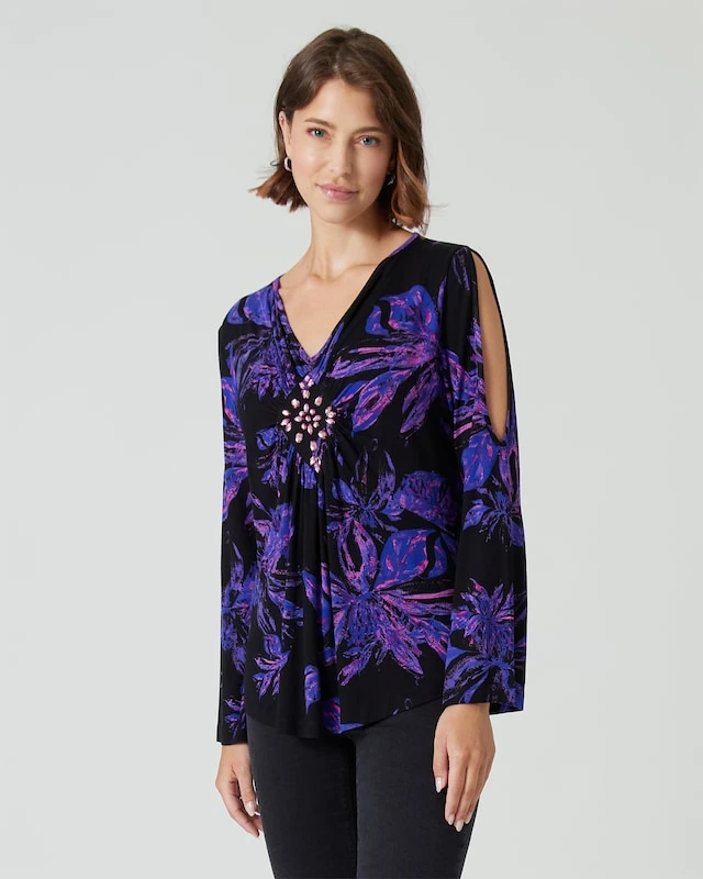 Dieses raffinierte Shirt von Maloo ist für alle Frauen, die ausdrucksstarke Mode lieben. Der modische Hingucker besticht einerseits durch den farbstarken Blumen-Print, andererseits durch die wunderschöne Applikation mit Drapé-Effekt. Eine feine, figurumspielende Viskosequalität macht den femininen Appeal perfekt. Ein toller Kombipartner zu eleganten Hosen und Röcken, aber auch zu lässigen Jeans.