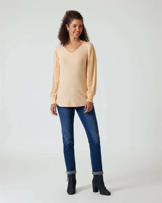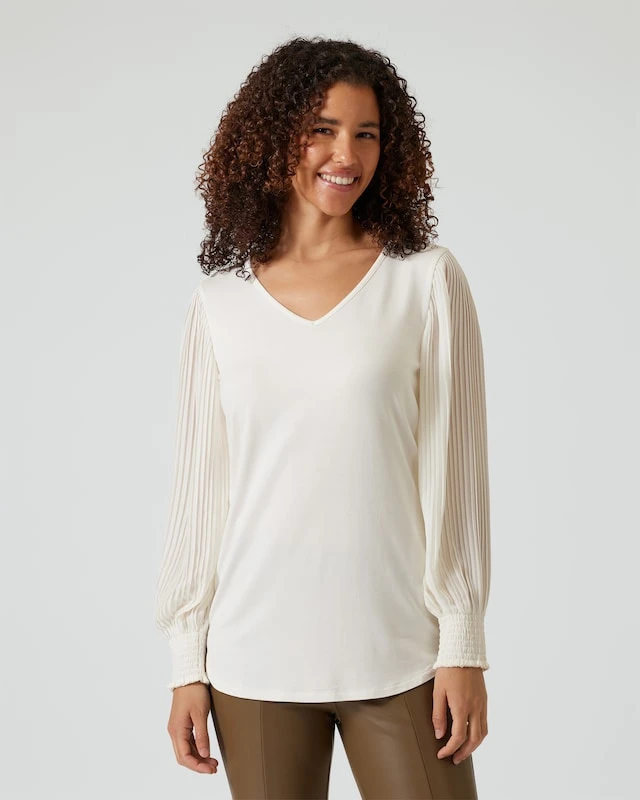 Auffallende Plissee-Ärmel sind der besondere Hingucker dieses Oberteils. Die langen Ärmel sind außerdem mit gesmokten Manschetten am Ärmelsaum gearbeitet.