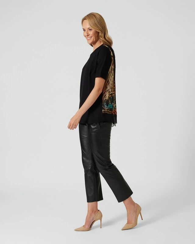 In diesem Shirt aus der Modelinie von Brian Rennie machen Sie auch von hinten eine aufregende Figur. Das Fashion-Piece zeigt im Rücken einen aufregenden Animaldruck mit einem schräg von oben nach unten laufenden schwarzen Band. Das Ganze aus feiner, glänzender Seide in überschnittener Form. Die kurzen Ärmel und das Vorderteil sind uni schwarz in schmaler, wundervoll femininer A-Linie designt. Setzen Sie mit diesem Highlight zu sexy, schmalen Hosen ein unwiderstehlich modisches Statement.