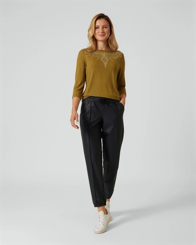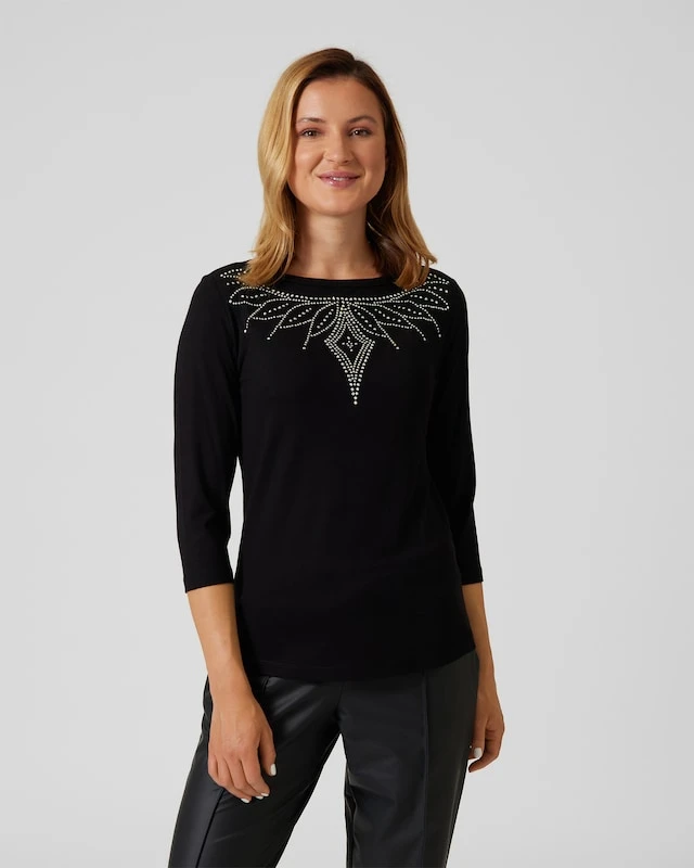 Dieses Shirt vereint stilvolles Design und höchsten Tragekomfort in einem Fashion-Piece, das Ihre Weiblichkeit gekonnt unterstreicht. Der modische U-Boot Ausschnitt verleiht dem Shirt einen Hauch von Raffinesse und betont Ihre Schulterpartie auf elegante Weise. Das edle Hot Fix Ornament aus Strass am Ausschnitt schenkt Ihrem Outfit zudem eine glamouröse Note und zieht alle Blicke auf sich. Der lässige 3/4-Arm verleiht Ihnen Bewegungsfreiheit und bringt Leichtigkeit in Ihren Look. Die feine Viskose-Stretch-Qualität des Shirts schmiegt sich sanft an Ihre Haut an und sorgt für ein angenehmes Tragegefühl. Erleben Sie puren Komfort und fühlen Sie sich rundum wohl.