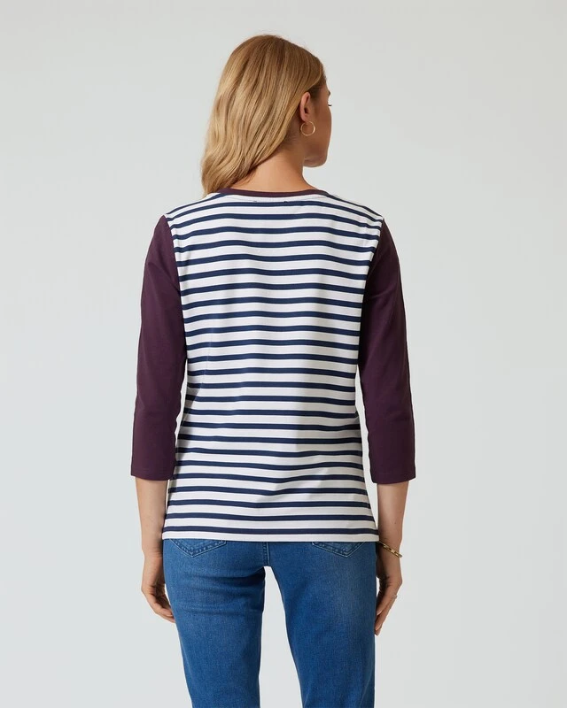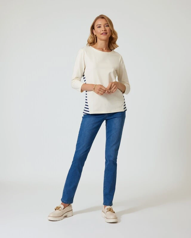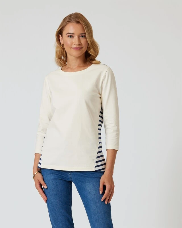 Sie mögen unkomplizierte Shirts mit dem gewissen Etwas? Dann könnte dieses modische Shirt von Fiora Blue genau das Richtige für Sie sein. Der sonst uni-farbene Style überrascht durch eine gestreifte Rücken- und Seitenpartie und hat ganz nebenbei einen optisch taillierenden Effekt. Das Shirt ist figurbetont mit Rundhalsausschnitt und 3/4-Ärmeln geschnitten. Ein toller Kombipartner für viele Looks.