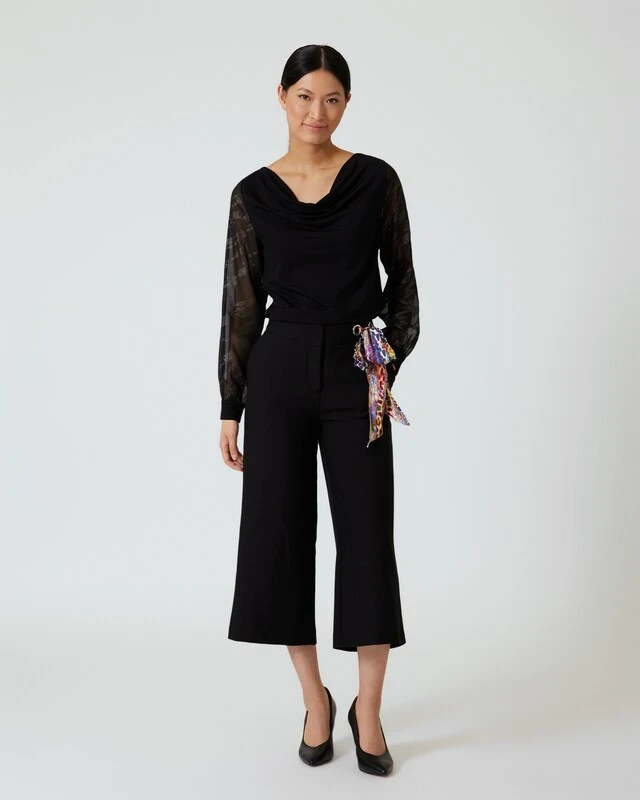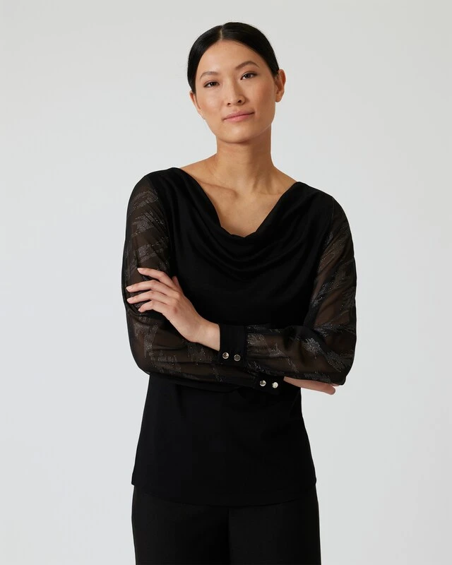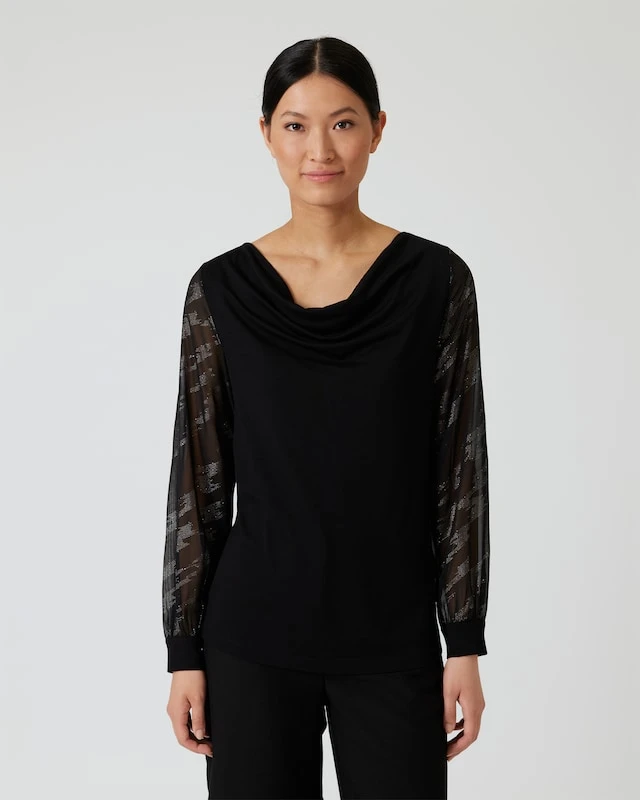 Mit diesem tollen Shirt haben Sie ein echtes Fashion-Piece an der Hand. Der raffinierte Hingucker ist in klassischem Schwarz gestaltet und besticht durch zahlreiche Schnitt-Details. So sind die weiten Ärmel in semi-transparentem Kontrastmaterial gefertigt, akzentuiert durch Ziersteine und Manschetten. Der schöne Wasserfallausschnitt betont den femininen Appeal, ebenso die feine Viskose. Von Brian Rennie.